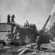 American troops of the 35th Coast Artillery firing 1,200 pound shells from an enormous 14 inch railway mounted gun at the opening...