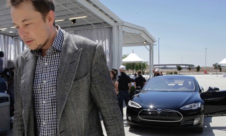 In this Friday, June 22, 2012 file photo, Tesla CEO Elon Musk walks past the Tesla Model S after a news conference...