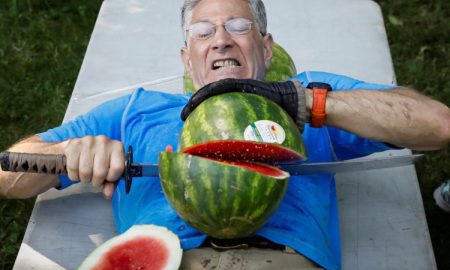 Ashrita Furman, who holds more Guinness World Records than anyone, attempts to set a new record for slicing the most watermelons in...