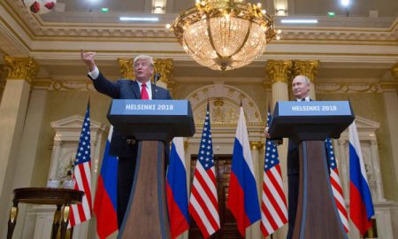 U.S. President Donald Trump, left, tosses a soccer ball to his wife first lady Melania Trump after Russian President Vladimir Putin presented...