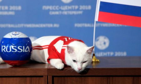 Achilles the cat, one of the State Hermitage Museum mice hunters, lies on a table after attempting to predict the result of...