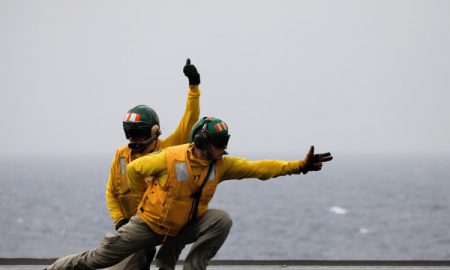 .S. Navy catapult officers, known as “shooters”, use hand signals before the take off of an F/A-18 fighter jet from the USS...