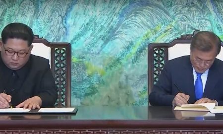 North Korean leader Kim Jong-Un, left, and South Korean leader Moon Jae-in signing a joint declaration.Screenshot/ Reuters TV After recent peace talks,...