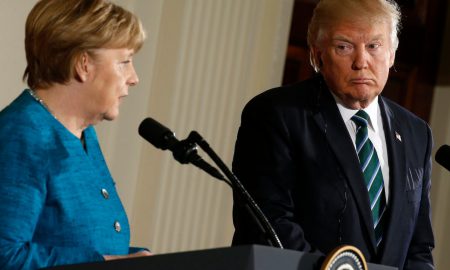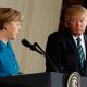 Germany’s Chancellor Angela Merkel speaks as U.S. President Donald Trump looks on during their joint news conference in the East Room of...