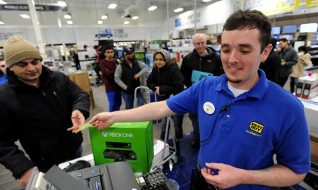 Just after midnight, Best Buy employee Christopher Gervais, right, hands back a credit card after he rang up a Xbox One game...