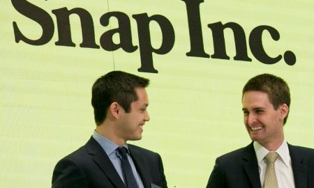 Snapchat cofounders Bobby Murphy, left, and CEO Evan Spiegel at the New York Stock Exchange as the company celebrated its initial public...