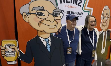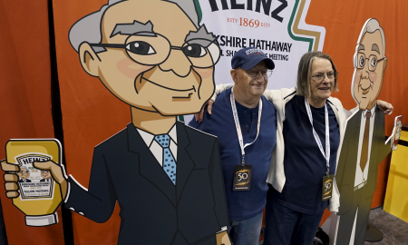 Berkshire Hathaway shareholders pose with likenesses of Berkshire CEO Warren Buffett, left, and vice chairman Charlie Munger at the shareholders’ shopping day...