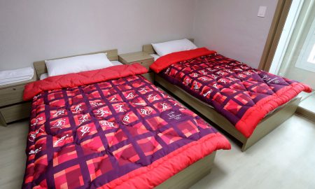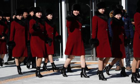 Members of North Korea’s Samjiyon art troupe wave as they leave the Gangneung Arts Center after touring the facility ahead of the...