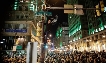 A man climbs a traffic pole as Philadelphia Eagles fans celebrate victory in Super Bowl LII against the New England Patriots on...
