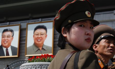 Soldiers stand in front of the podium with portraits of North Korea founder Kim Il-sung and the late leader Kim Jong-il, after...