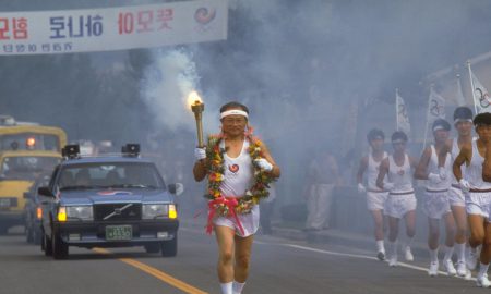 An athlete from Korea carries the Olympic torch during the 1988 Olympic Games in Seoul, South Korea on September 13, 1988.Joe Patronite...