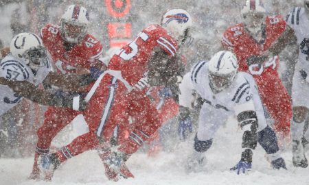 AP Photo/Jeffrey T. Barnes Snow has taken over the Bills-Colts game in Buffalo, making for a surreal, wintry scene. The Bills had...