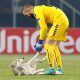 Vardar goalkeeper Filip Gacevski stopped to give the dog a tickle.Reuters A cute dog went walkies and found its way onto a...