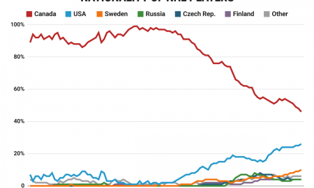 More Charts The percentage of NHL players who are from Canada has fallen to 46.1%,according to data collected by QuantHockey.com. Meanwhile, the...