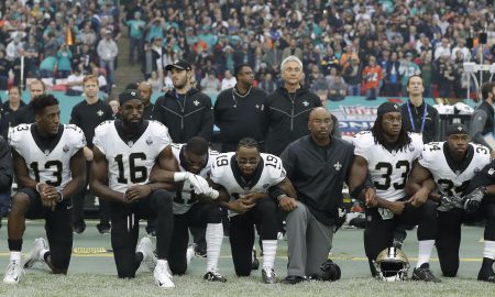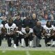 New Orleans Saints players kneel down before the U.S. anthem was played for an NFL football game against the Miami Dolphins at...