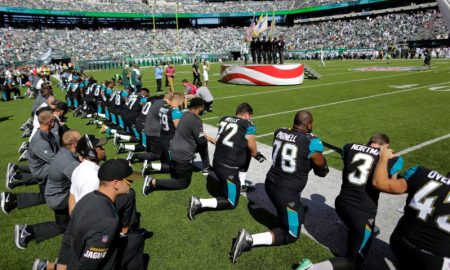 Jacksonville Jaguars players kneel before the national anthem before their NFL football game against the New York Jets in East Rutherford, New...