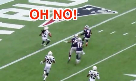 CBS/NFL Los Angeles Chargers wide receiver Travis Benjamin bobbled a punt against the New England Patriots. As Benjamin recovered it, he ran...