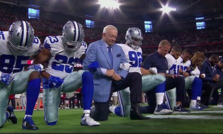 ESPN The entire Dallas Cowboys team, including coaches, front office personnel, and owner Jerry Jones, locked arms and took a knee prior...