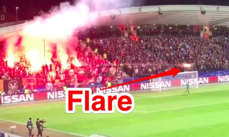 Spartak Moscow fans lit flares and smoke bombs in the away section at Maribor, Slovenia.Screenshot A Champions League football match between Spartak...