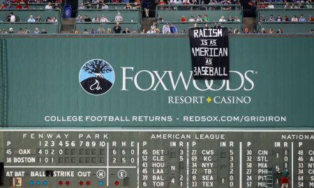 Banner protesting racism at Fenway Park during Boston Red Sox game.Maddie Meyer/Getty Images Protesters hung a banner on the Green Monster at...