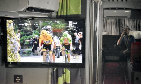 Slipstream Sports CEO and Cannondale-Drapac manager Jonathan Vaughters, right, watches a TV at the back of his team bus as his rider...