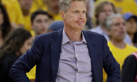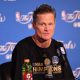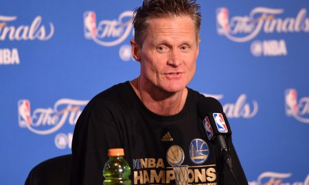 Steve Kerr of the Golden State Warriors speaks at the press conference after his teams 129-120 victory over the Cleveland Cavaliers in...