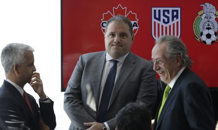 Victor Montagliani (L), President of the Canadian Soccer Association, Sunil Gulati (M), President of the United States Soccer Federation, and Decio de...