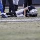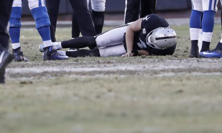 Oakland Raiders quarterback Derek Carr (4) remains on the field after an injury during the second half of an NFL football game...