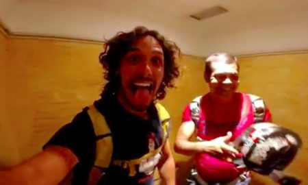 Arthur Zanella and Thiago Negao don their gear before BASE jumping from a building in São Paulo, Brazil, November 2016.Arthur Zanella and...