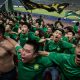 Ultra supporters and fans of the Beijing Guoan FC celebrate together after a goal against Chongcing Lifan FC during their Chinese Super...