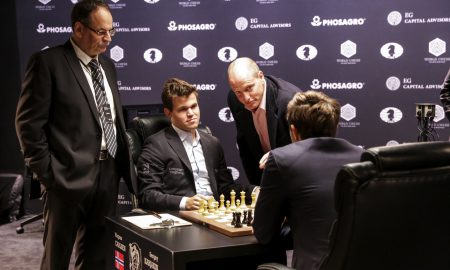 The ceremonial first move was made by Woody Harrelson.Polina Gurtovaya NEW YORK — Norway’s Magnus Carlsen started the defense of his World...