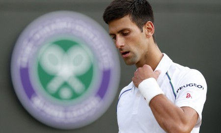Novak Djokovic of Serbia reacts during his match against Kevin Anderson of South Africa at the Wimbledon Tennis Championships in London, July...