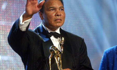 AP Photo/Fabian BimmerFormer heavyweight-boxing legend Muhammad Ali waves to the audience after receiving the “Bambi Trophy” during the Bambi Media Award in...