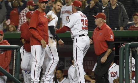 Nick Wass/AP Bryce Harper was ejected by umpire Brian Knight in the bottom of the 9th inning of the Nationals’ walk-off win...