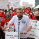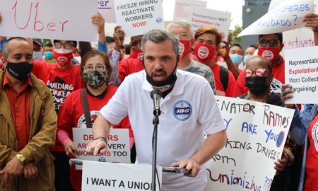 Protesters gathered in bright red t-shirts and matching masks bearing the Independent Drivers Guild logo. Placards bearing slogans like “Freeze Hiring, Reactive...