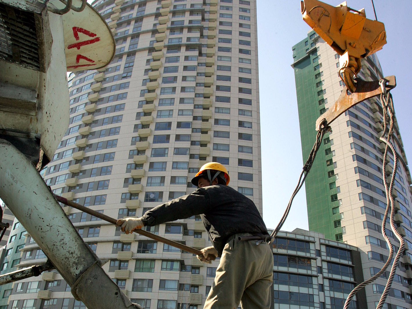A worker shovels concrete from a mixer outside a new apartment building in Beijing.AP Photo/Greg Baker