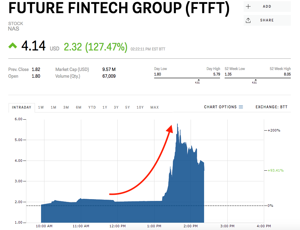 Future Fintech Group previously received a written warning from Nasdaq on December 1 for failing to maintain a market value above $5 million and risked being delisted if it did not pass the threshold by May 2018, according to public filings. Today’s jump brings the firm’s market cap to roughly $9.57 million.