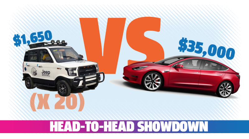 Illustration for article titled Comparison: Tesla Model 3 vs. 20 Chinese EVs That Sort Of Look Like Ford Raptors But Have 'Jeep' On Them