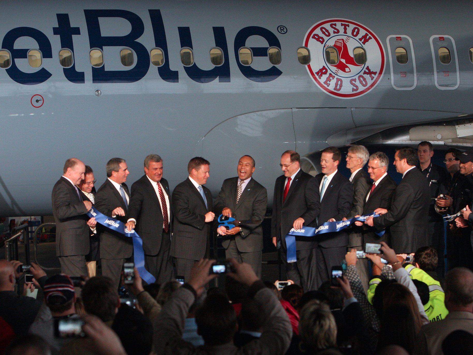A ribbon cutting ceremony to celebrate JetBlue Airways move to historic Hangar 8 at Logan International Airport in BostonAP/Aynsley Floyd