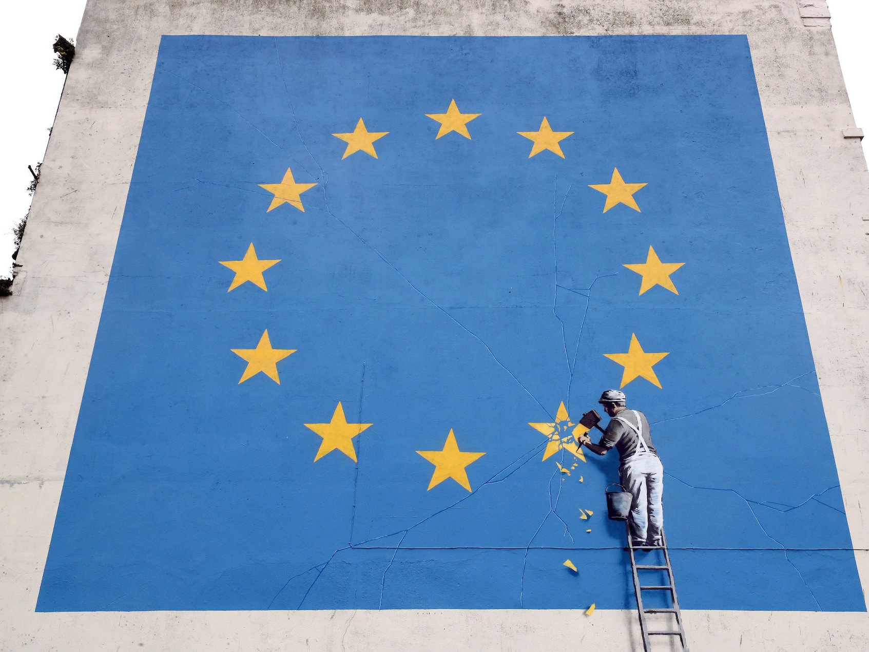 A view of a mural by artist Banksy of a workman removing a star from the EU flag which appeared yesterday near the ferry terminal in Dover, Kent.Gareth Fuller/PA Wire/PA Images