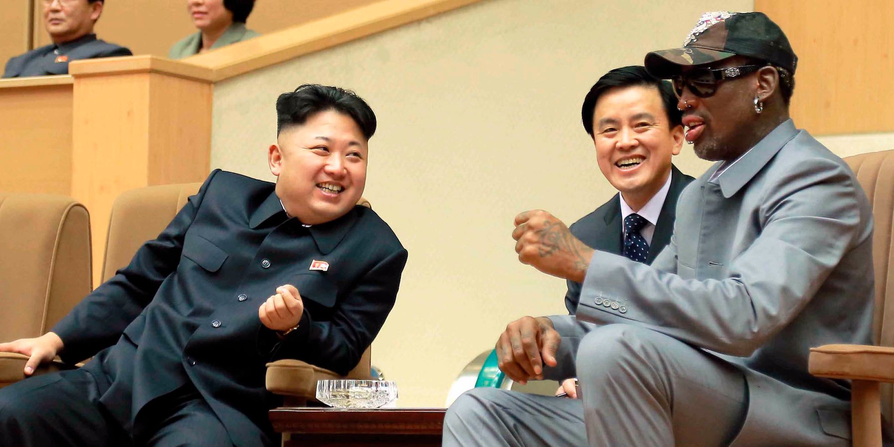 North Korean leader Kim Jong Un (2nd L) watches a basketball game between former U.S. NBA basketball players and North Korean players of the Hwaebul team of the DPRK with Dennis Rodman (R) at Pyongyang Indoor Stadium in this undated photo released by North Korea’s Korean Central News Agency (KCNA) in Pyongyang January 9, 2014.REUTERS/KCNA