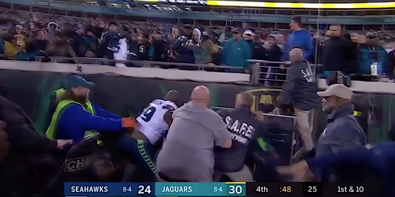 The Seattle Seahawks-Jacksonville jaguars game turned ugly late after a scuffle on field and near-scuffle between a player and fans.