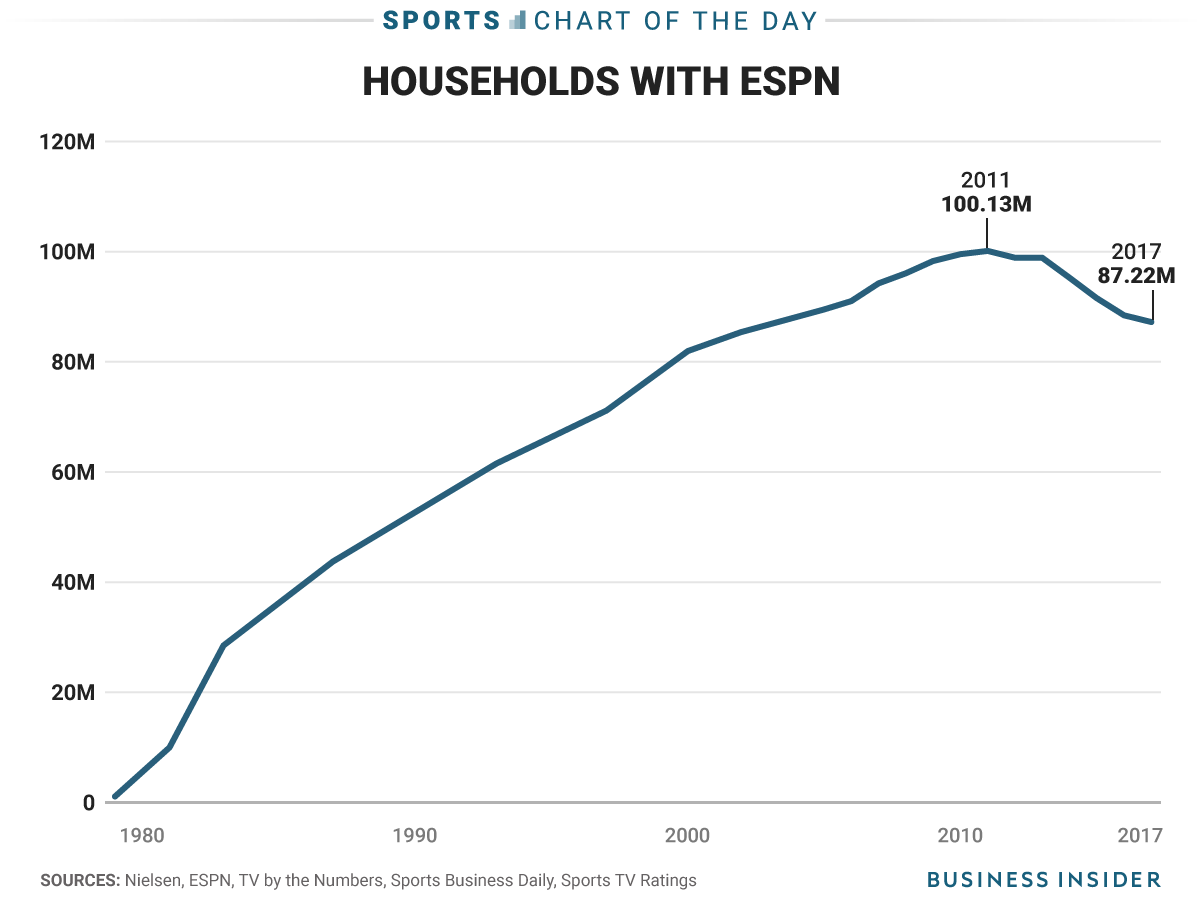 ESPN has indeed lost nearly 13 million subscribers in the last six years, from its peak of 100.12 million in 2011 to 87.22 million in the most recent estimates, according to Nielsen (continued below).