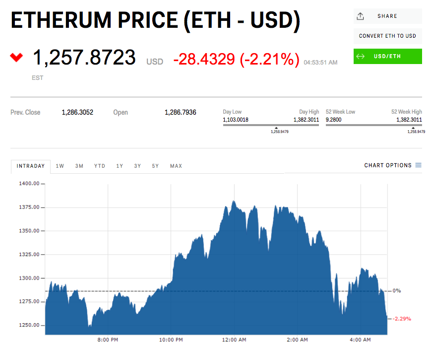 Just after midnight UK time, ethereum’s price broke as high as $1,375, having only surpassed $1,000 during trade over the weekend. Ethereum has since slipped into negative territory, losing around 2.3% as of just before 10.00 a.m. GMT (5.00 a.m. ET) as the chart below illustrates: