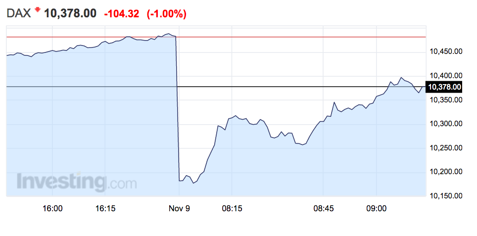 All of Europe’s biggest bourses are significantly down soon after the European open, crashing lower thanks to the uncertainty that a Trump presidency brings to the markets.