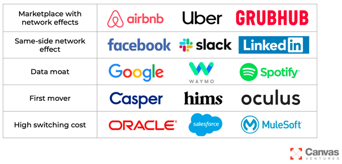 The most important elements for founders to consider when figuring out their strategic advantage(s) include one-sided or “direct” network effects (e.g., with social media sites like Facebook), marketplace network effects (e.g., with two-sided marketplaces like Uber), data moats, first mover and switching costs.
