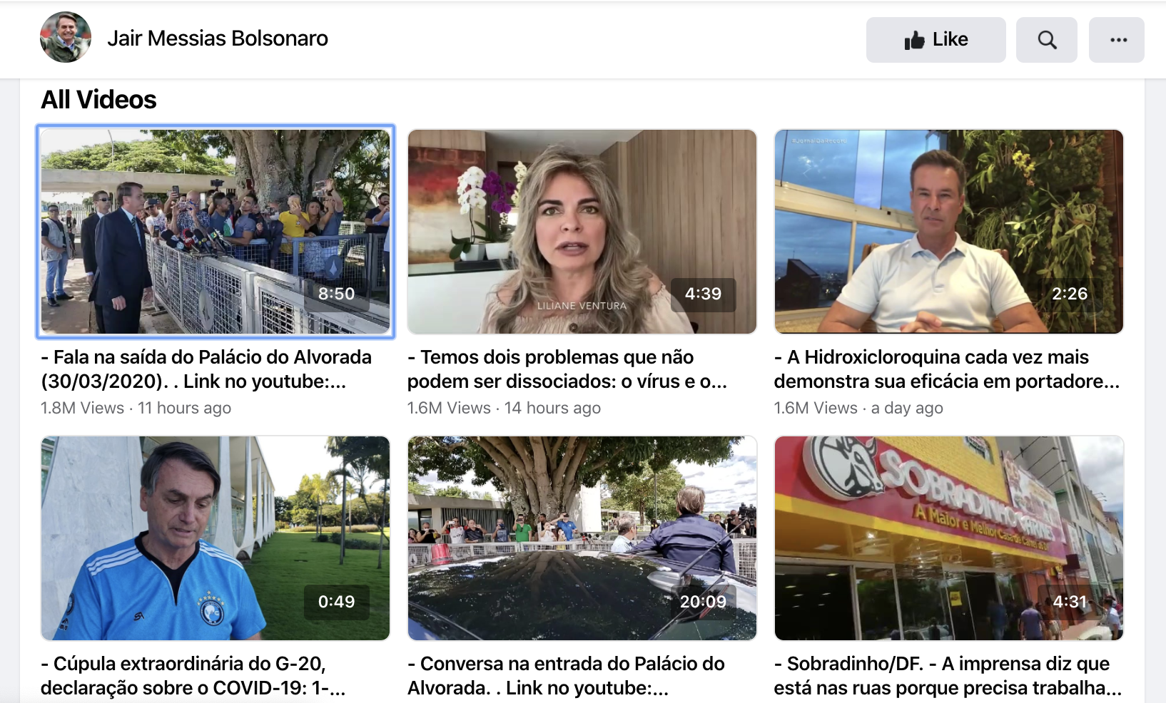 BBC News Brazil first reported the takedown today in Portuguese. In the removed video, Bolsonaro had been speaking to a street vendor, and the President claimed “They want to work”, in contrast to the World Health Organization’s recommendation that people practice social distancing. He followed up that “That medicine there, hydroxychloroquine, is working in all places.”
