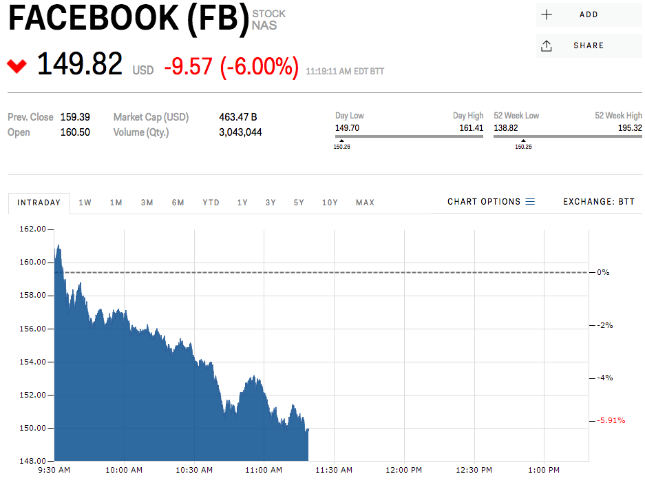 Facebook is officially in bear market territory, down more than 20% from recent highs, as the FTC confirms a probe into the Cambridge Analytica data privacy scandal. Shares are down more than 6% on Monday to an intraday low of $149, the lowest the stock has been since July 7, 2017.