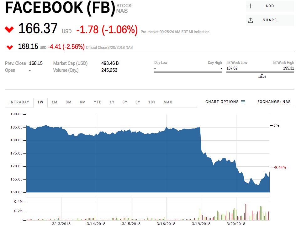 The stock dropped sharply Monday after news broke that a political research firm, Cambridge Analytica, had illegitimately accessed 50 million user accounts. Shares then tumbled again on Tuesday when reports said the FTC would investigate whether the social media giant “violated terms of a consent decree over its use of personal data.”