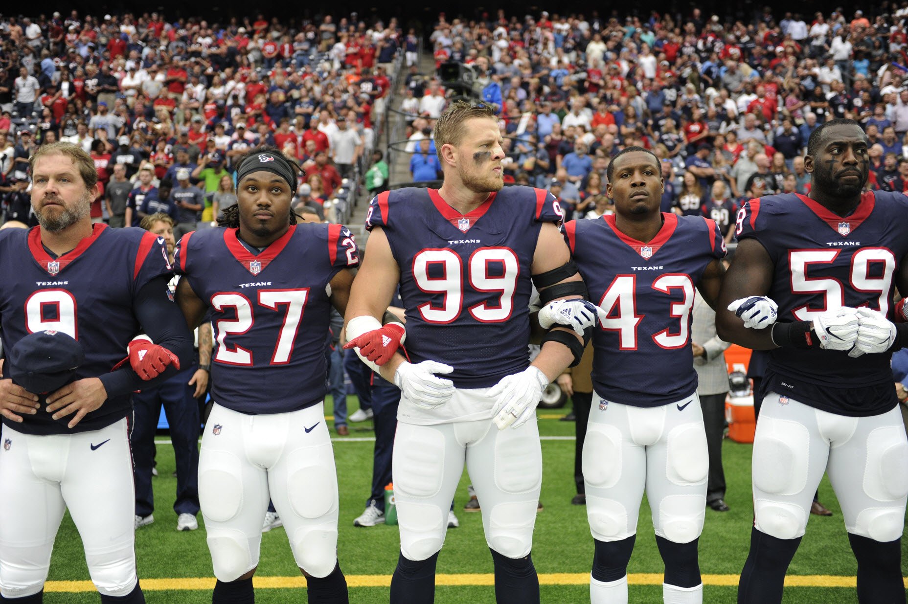 After the president’s comments, players and teams put on a show of unity during Week 3, with more players kneeling for the anthem than ever before. Other teams teams chose to stand together arm-in-arm with each other, in a trend set early in the day by the Ravens-Jaguars game in London that carried on throughout the day. The Seahawks and Titans decided to forego the national anthem altogether, remaining in their locker rooms as the song played ahead of their game.